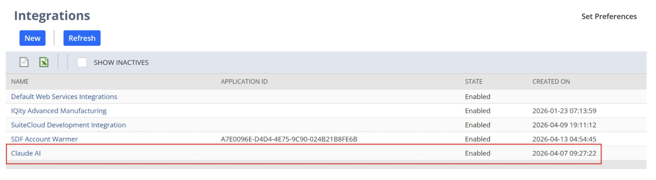 NetSuite automatically creates an integration record for Claude