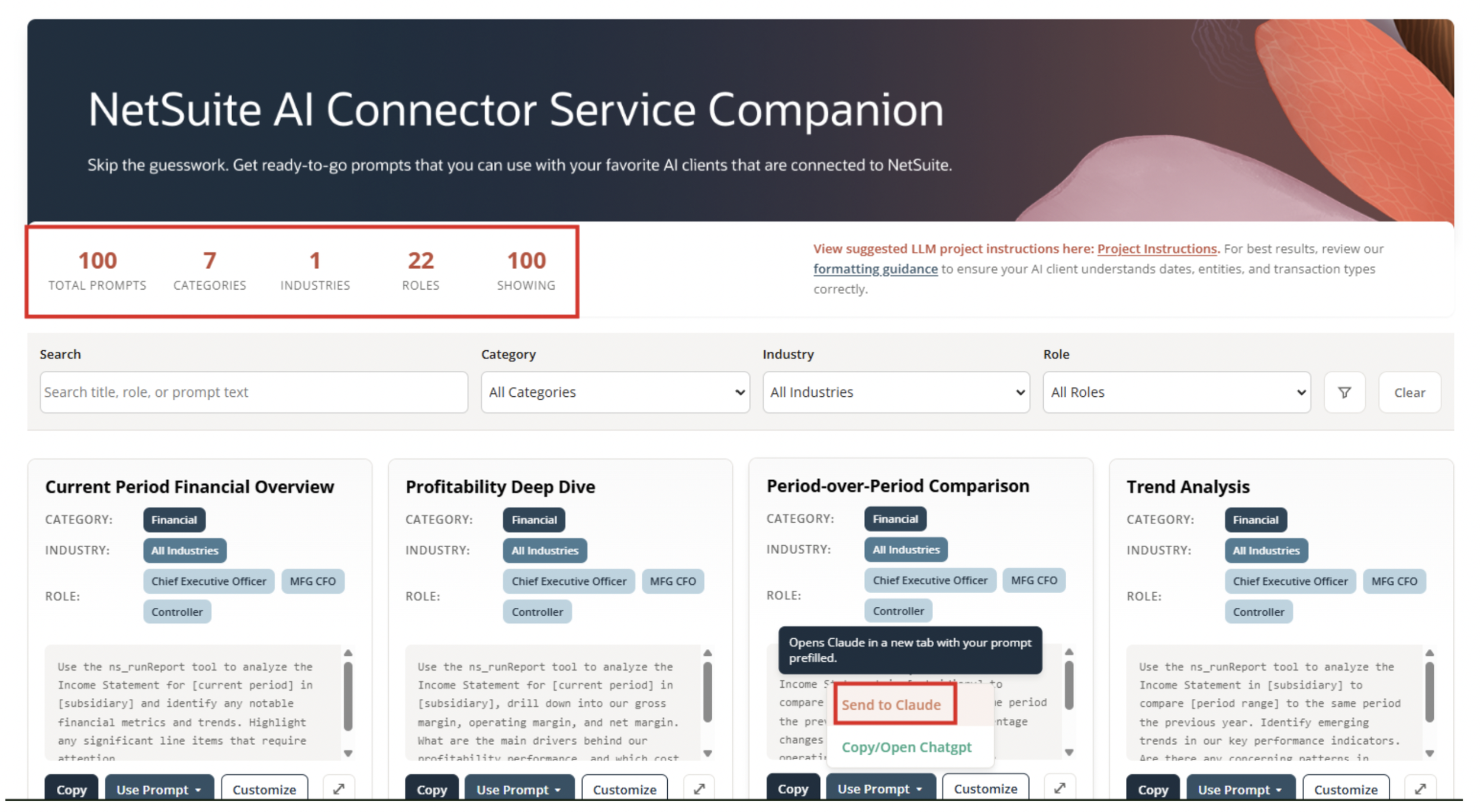 Browse through the different prompts and hover over “Use Prompt” and click on “Send to Claude” to use the prompt!