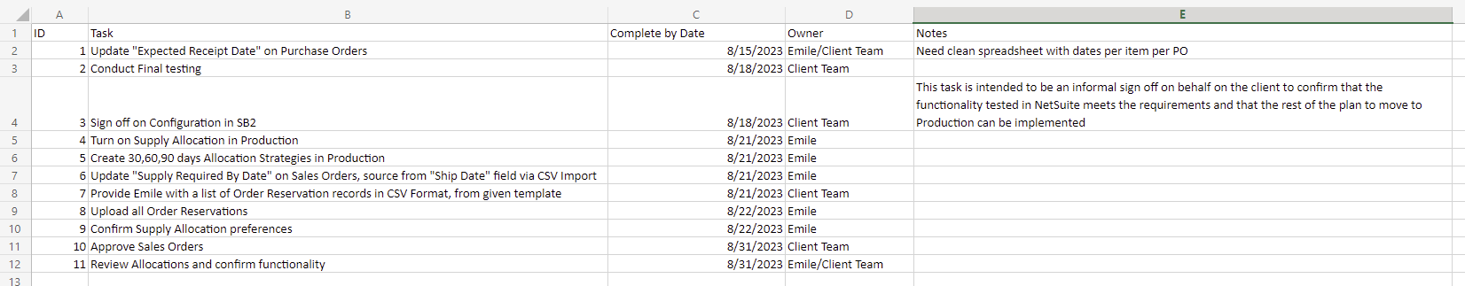 This is perhaps the most critical step. A good cutover checklist includes the Task, Description, Owner, Date to be Completed By, and Status. Your consultant should be the one to complete this. See screenshot below for an example of a cutover checklist, specifically for the Supply Allocation Module.
