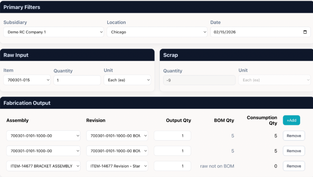 The Fabrication Tool extends NetSuite manufacturing to handle advanced production scenarios that require flexible input-output relationships and automated assembly logic.